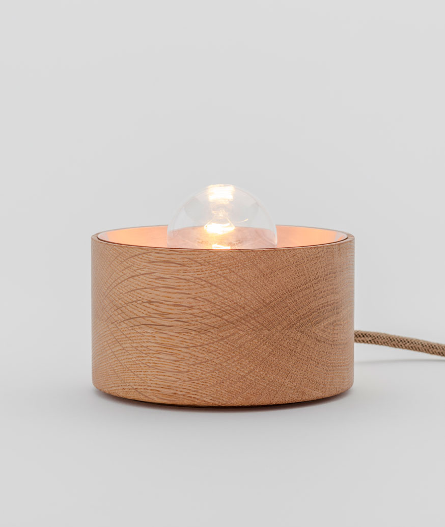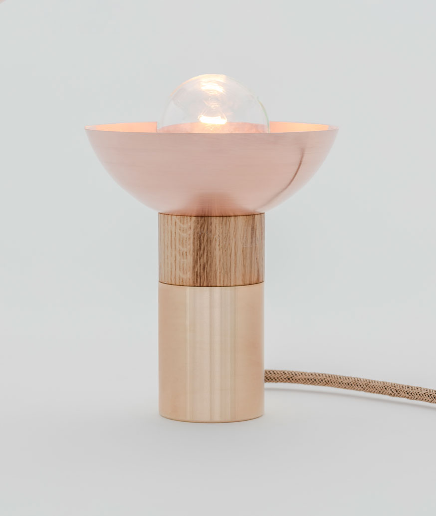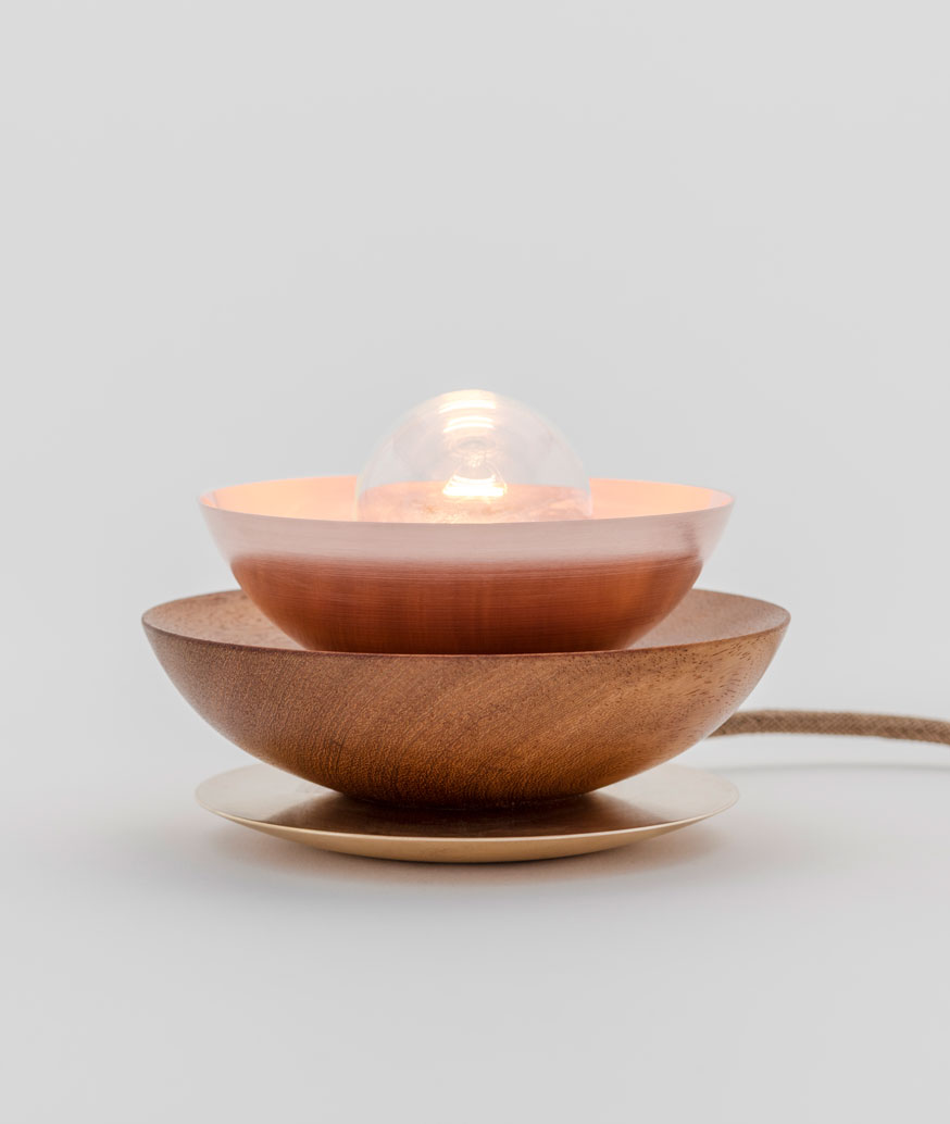 Candil was conceived as a tabletop version of Cornucopia. Although the technical principle remains the same, our aim is to reduce the lamp to three basic elements. Copper and brass act as optimal conductors, while wood acts as an insulator.The carefully crafted shapes of the copper bowls allow the bulb to slide effortlessly into place, while their warm shades gently soften the quality of the light giving it a candle-like effect.